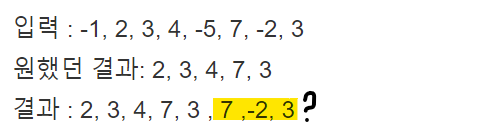 // 입력 : -1, 2, 3, 4, -5, 7, -2, 3