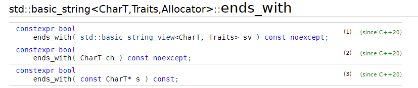 std::string / string_view 에 추가 된 내장함수로 perfix/suffic checking 접두사와 접미사를 체크 할 수 있는 함수가 c++20에 새로 생겼다.