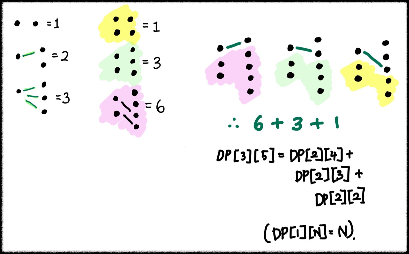 그럼 이렇게 해서 N(강 서쪽) : 3개의 사이트 M(강 동쪽) : 5개의 사이트가 있다고 가정할 때 다리끼리 서로 겹쳐지지 않고 다리를 지을 수 있는 경우의 수는 < DP [ 3 ][ 5 ] = DP [ 2 ][ 4 ] + DP [ 2 ][ 3 ] + DP [ 2 ][ 2 ] >이다.