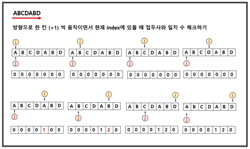 - 찾았다면 [ i ]와 [ j ] 둘다 증가 시킨다. j의 인덱스는 일치인 [ i ] 인덱스 번째 숫자 테이블에 ++j을 적는다.