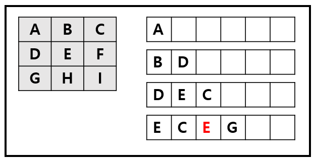 그렇게 되면 아래와 같이 E가 que에서 pop되고 방문처리하기 전에 D에서 'visit false군!!" 하면서 que에 넣으면서 무한루프에 빠져버린다.