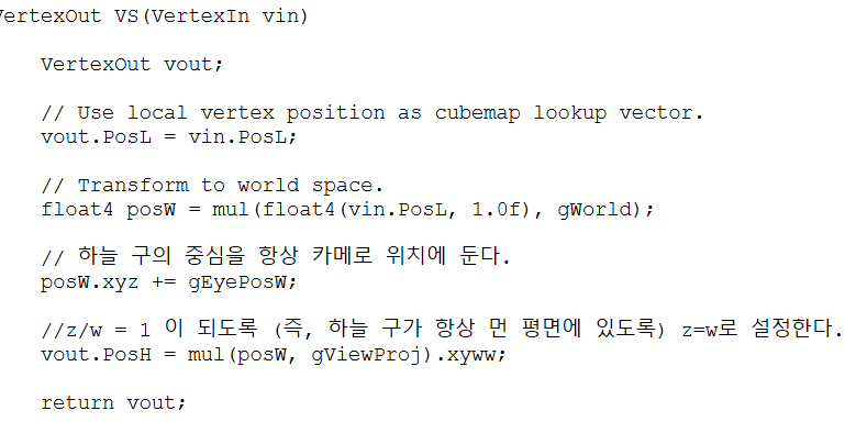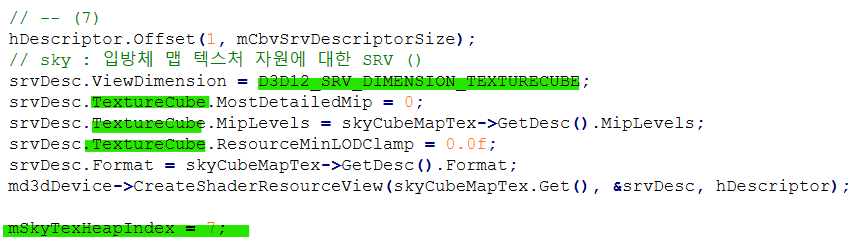 큐브맵만 따로 서술자 힙을 만들어서 할당할 게 아니면 몇 번째 서술자가 TextureCube인지 알아야 하므로 mSkyTexHeapIndex으로 큐브맵 서술자 인덱스를 맵버변수로 가지고 있어야 한다.