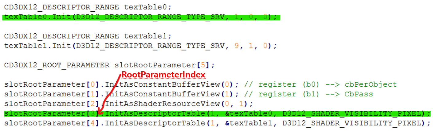 slotRootParameter[2].InitAsShaderResourceView(0, 1);