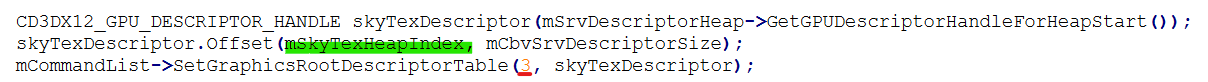3번에서 본 mSkyTexHeapIndex 인덱스 7번 DescriptorHeap을 1번에서 본 (RootParameterIndex 3번) 에 연결하겠다. 즉 t0에 디퓨즈 텍스쳐 mSkyTexHeapIndex에 있는 매터리얼 정보를 넣겠다고 받아들이면 된다.