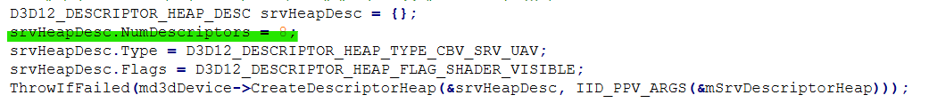 - 계속해서 프로젝트를 새로 만들지 않고 있다면 NumDescriptors의 개수가 늘어나고 있을것이다 .. 쉐이더 리소스 뷰의 개수를 잘 세어서 크기를 지정해 주자.