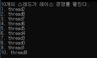 std::cout << "10개의 스레드가 레이스 경쟁를 펼친다.\n";