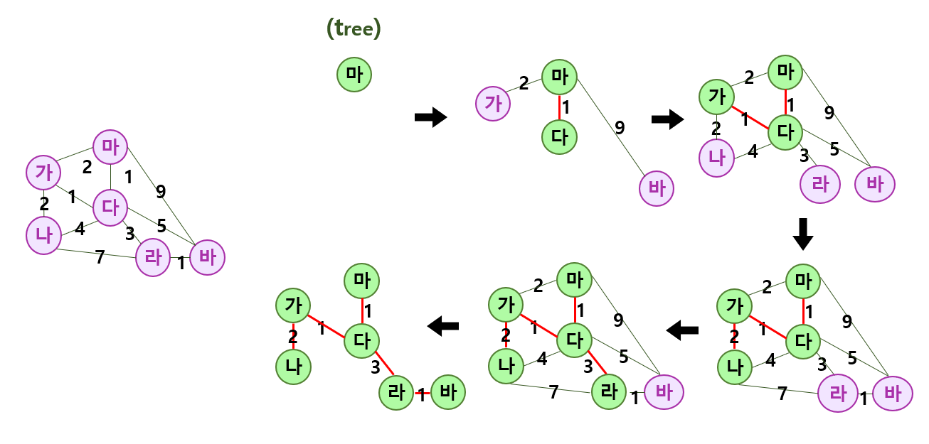 ※ 프림은 시작점을 정하고, 시작점에서 가까운 정점을 선택하면서 트리를 구성하는데 그 과정에서 사이클을 이루지 않지만 크루스칼은 시작점을 따로 정하지 않고 정렬 후 가장 최소 비용으로 간선을 선택하기 때문에 사이클이 발생하는지 판단하면서 진행해야 한다.