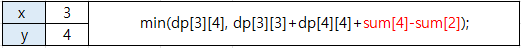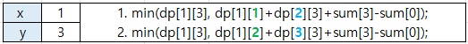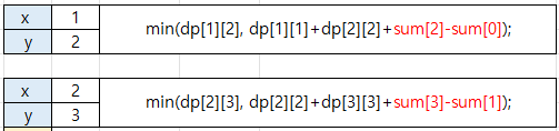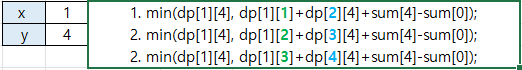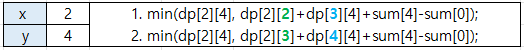 dp[x][y] = min(dp[x][y], dp[x][mid]+dp[mid+1][y]+sum[y]-sum[x-1]);