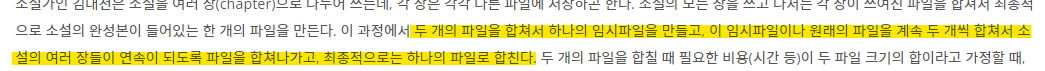 소설가인 김대전은 소설을 여러 장(chapter)으로 나누어 쓰는데, 각 장은 각각 다른 파일에 저장하곤 한다. 소설의 모든 장을 쓰고 나서는 각 장이 쓰여진 파일을 합쳐서 최종적으로 소설의 완성본