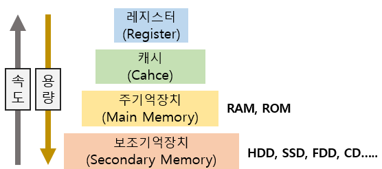 | 보조기억장치 | - 프로그램이나 자료를 영구적으로 기억할 수 있는 기억장치 - 주기억장치에 비해 기억된 애용을 읽는 속도는 느리지만 대용량 기억이 가능 - 현재 사용하지 않는 프로그램은 보조 기억 장치에 저장 - 작업이 수행될 때, 보조 기억 장치에서 주 기억 장치로 정보를 이동함(program loading) - 보조기억장치 종류: FDD, HDD, CD, DVD USB, CF(compact flash), SSD(solid state drive) |
