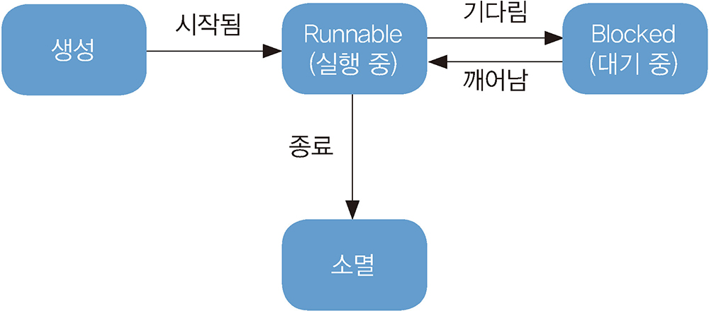 | 중단(blocked) | - 어떤 이벤트가 발생한 이후 기다리며 프로세스가 차단된 상태.I/O 디바이스에 의한 인터럽트로 이런 현상이 많이 발생된다. |