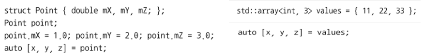 구조적 바인딩을 이용하면 여러 개의 변수를 선언할 때 배열, 구조체, 페어 또는 튜플의 값으로 초기화할 수 있다. 구조적 바인딩을 적용하려면 반드시 auto 키워드를 붙여야 한다. non-static이면서 public으로 선언된 데이터라면 어떤 것도 적용할 수 있다.