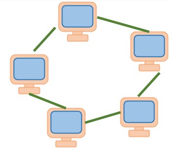 | 링형(ring) | 네트워크 구성변경이 어렵다. 회선장애시 전체 네트워크에 영향을 끼치는 단점이 있다. 병목 현상이 드물고 검사, 회복이 쉽다. |