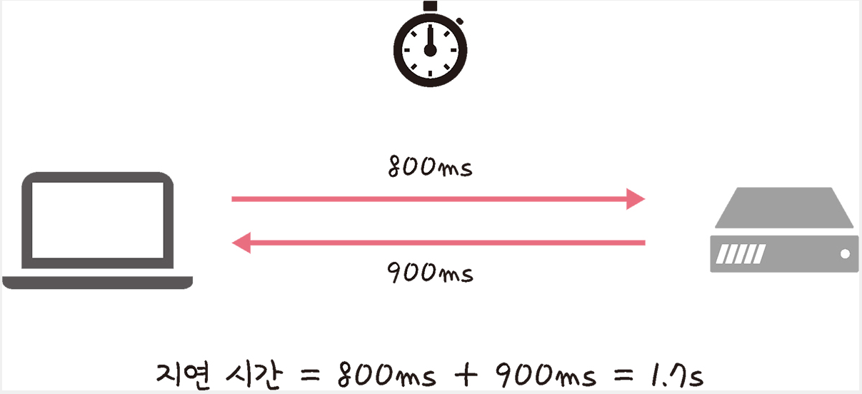 | 추가 설명 | 트래픽, 네트워크 장치 간의 대역폭, 네트워크 중간에 발생하는 에러, 장치의 하드웨어 스팩의 영향을 받음. * 대역폭: 주어진 시간 동안 네트워크 연결을 통해 흐를 수 있는 최대 비트 수 |