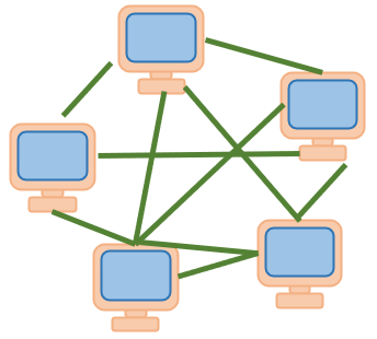 메시(mesh) | 한 단말 장치에 장애가 발생해도 여러 개의 경로가 존재하므로 네트워크를 계속 사용할 수 있고 트래픽도 분산 처리가 가능하다. 노드 추가가 어렵고 구축 비용과 운용비용이 고가이다. |