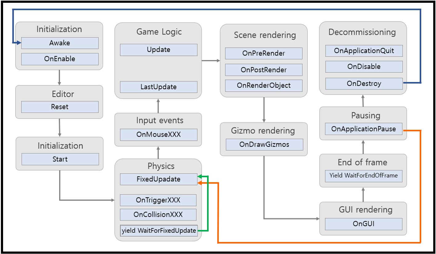 | OnGUI | GUI 이벤트에 따라 프레임당 여러 번 호출 레이아웃 및 리페인트 이벤트는 우선 처리되며 각 입력 이벤트에 대해 레이아웃 및 키보드/마우스 이벤트가 다음으로 처리. |