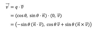 일반적으로 사용하는 3차원 공간의 벡터v는 순허수 사원수에 대응되는 개념이다. 벡터v의 값을 (x, y, z)로 표시하고, 회전축 벡터n의 값을 (a, b, c)로 지정해보겠다. 회전축은 단위 벡터이기 때문에