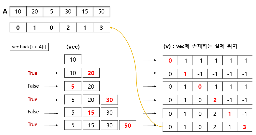 - 2번 3번 할 때 v 배열에 현재 idx에서 A[idx]가 vec[i] 중 어디 i에 들어갈지 넣어준다.(vec에 존재하는 실제 위치 14003번의 출력값이 된다.)