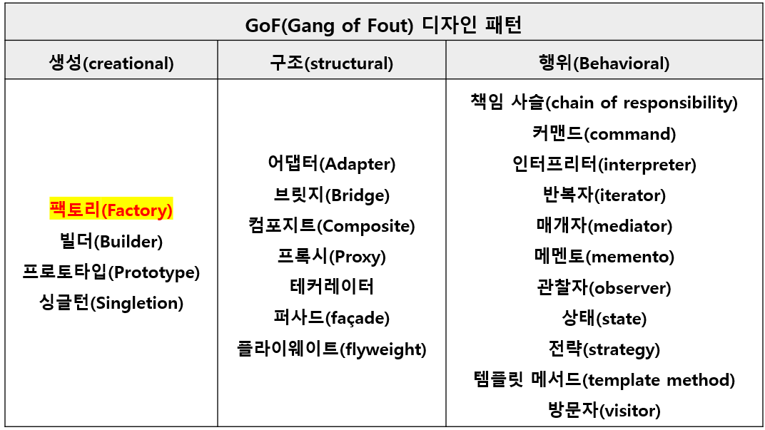 객체를 생성할 때 그 객체의 생성자를 직접 호출하지 않고, 객체 생성을 담담하는 팩토리에 요청하는 구조를 뜻한다.